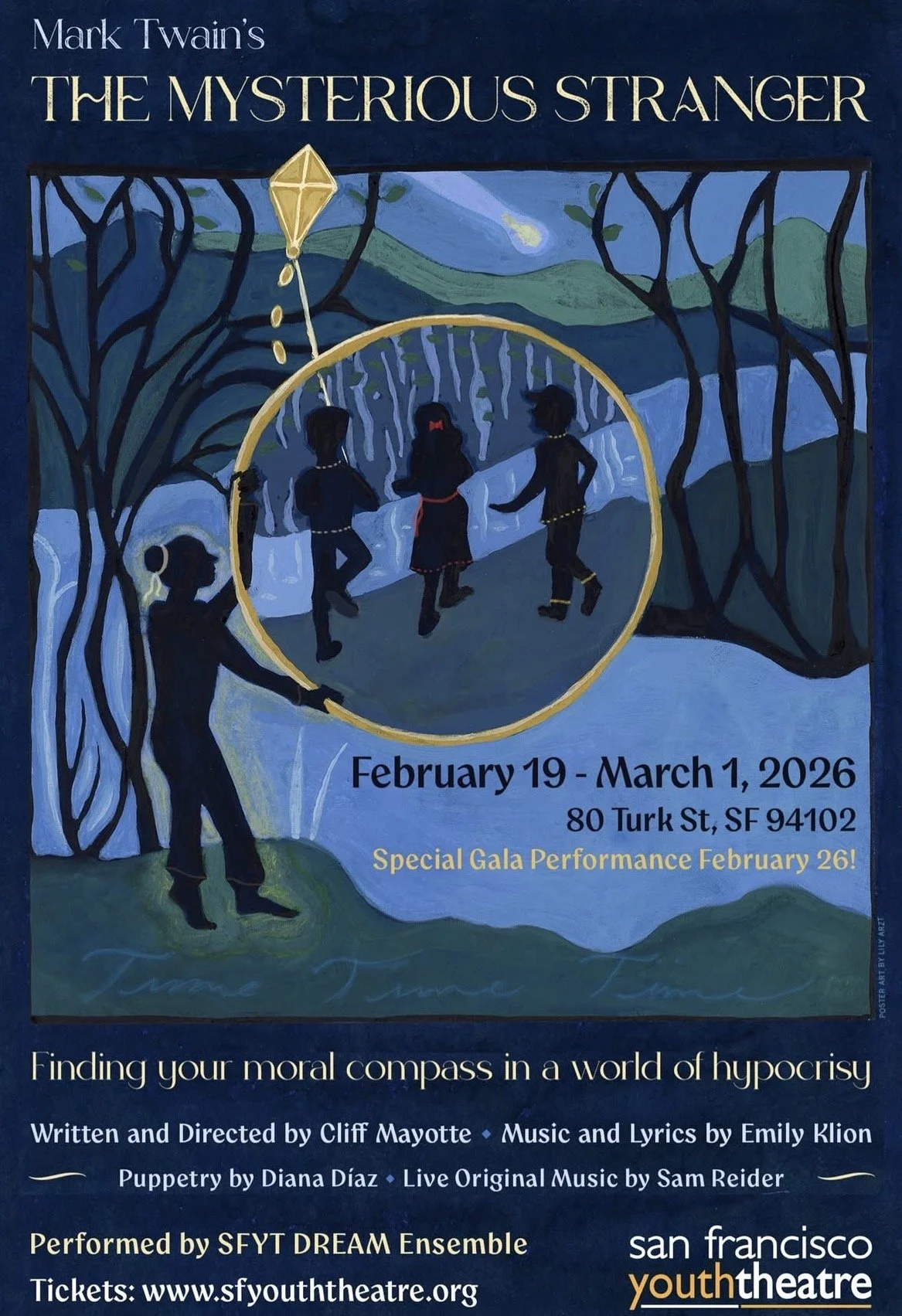 From February 19–March 1, 2026, SF Youth Theatre presents The Mysterious Stranger at CounterPulse, performed by the SFYT Dream Ensemble. The production features puppetry direction by Dyana Diaz, whose visual storytelling blends shadow puppetry, movement, and projection to expand the world of the play. The puppetry is brought to life by a collaborative crew of Sánchez Sánchez & Jess Nguyen, creating evocative and imaginative stage imagery. Together, the team elevates this youth-driven production into a bold, interdisciplinary theatrical experience rooted in curiosity, wonder, and transformation.