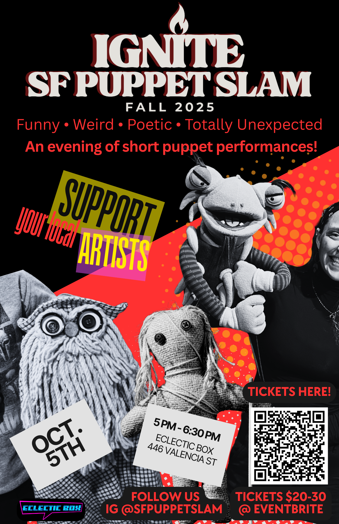 Join us Sunday, October 5th, 2025, at Eclectic Box for SF Puppet Slam! — a variety show celebrating the wild, weird, and wonderful world of puppetry. Local artists will take the stage with short-form performances and works-in-progress featuring everything from shadow puppets to sock monsters, marionettes, and more.